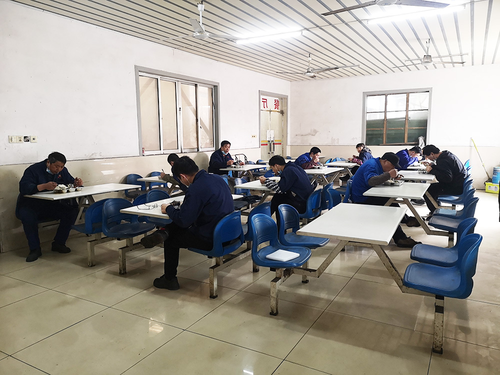 食堂采用分批分餐制,全新的餐具分別激光打上編號,一人一號,報號取餐,餐具集中消毒清洗,讓全體員工安心復工,放心用餐。
