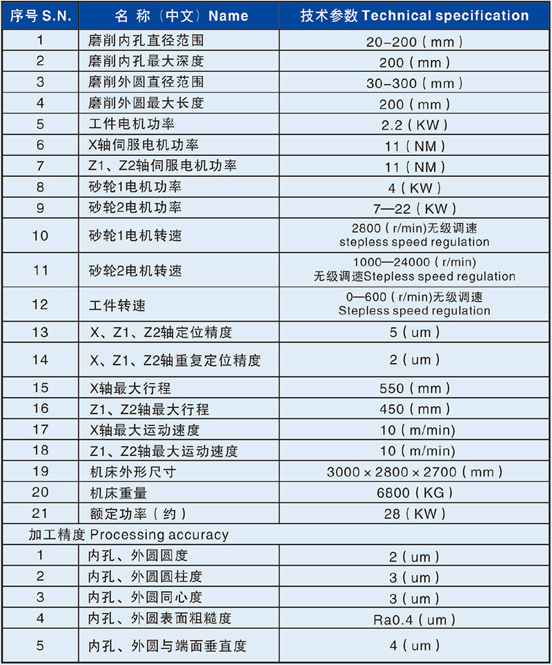 ●本機床為三軸(X進給、Z1砂輪、Z2砂輪軸)二聯動數控復合磨床,主要用于磨削工件的內圓孔、內錐孔、臺階孔、內端面、外圓、外端面。磨削循環均自動完成(具有自動進刀、退刀、粗磨、精磨;自動修正砂輪、自動補償等功能)。